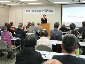 朝倉支部及び東部支部では、2月16日朝倉地域生涯学習センターにおいて、中村学園大学教授 占部賢志氏を講師に招いて、「絆 〜語り継ぎたい美しい日本人の物語〜」という演題で、それぞれの支部会員及び地域住民を対象に、地域の活性化に資するため公開講演会を開催しました。 同日は、一般市民を含め約50名が出席しました。 |